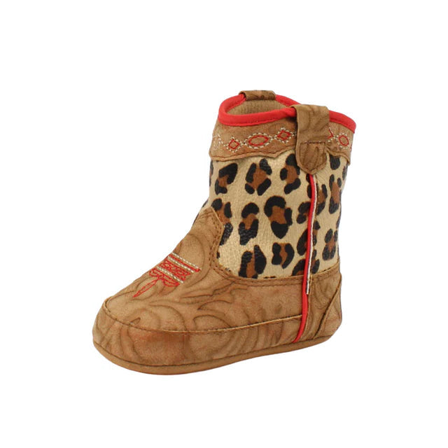 Your little one is sure to be a charmer with these Blake baby bucker boots by M&F Western Products. Leopard print shaft that is decorated with red piping and boot pulls. Side Velcro closure for easy on/off. So comfortable that your little cowpoke will want to wear them all day.