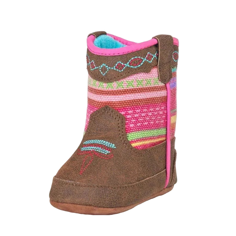 Give your little one an eye for western inspired fashion at a young age with the Camilla Baby Bucker by M&F Western Products®. It features a medium brown boot with a multi colored shaft and pink trim. So comfortable that your little cowgirl will want to wear them all day.