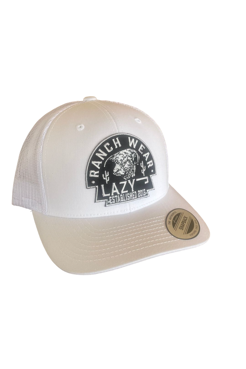 Lazy J Ranch Wear Black Arrowhead patch Cap. White front, white mesh back. 3.5 inch crown. White 3.5"crown with Black Arrowhead patch. Snap back.