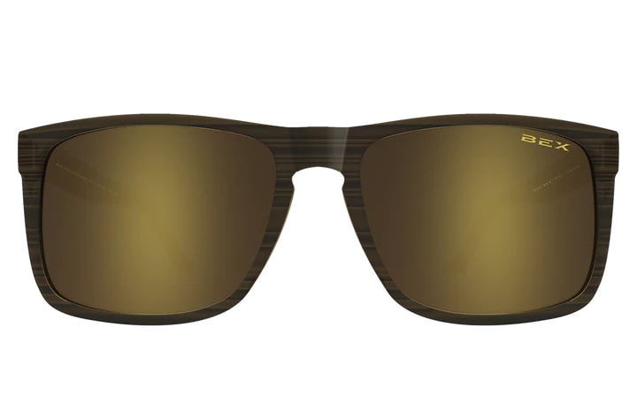Tortoise striped brown thermal plastic frame with gold foil logo embedded into the temple.