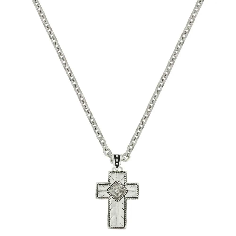 A thick cross pendant with broad arms that are designed with feather detail including slight gaps in the vane giving it a realistic look. A center lightly antiqued silver finished floral accent is framed by pin points that have a deep antiqued border. The edges of the pendant are lined with the same silver finished pin points against the hand-painted deep antiqued background. Pendant is linked to a pin point designed bale on a thick cable 22 inch chain.