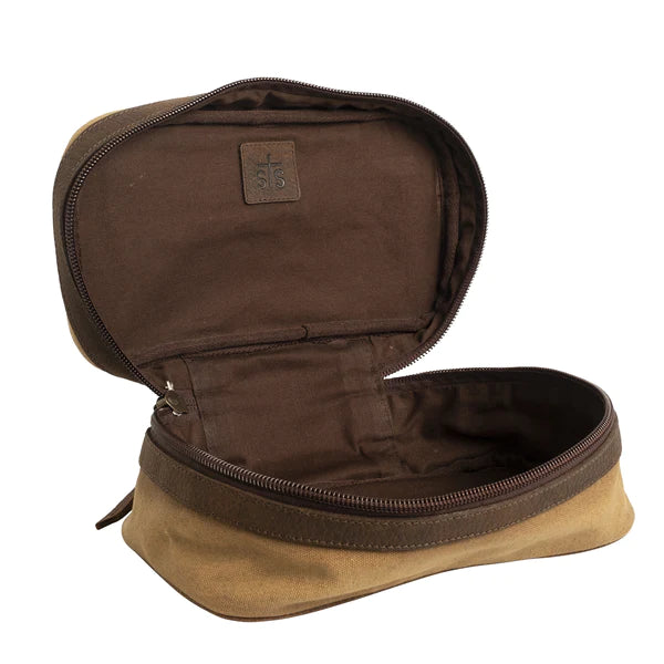 - Side distressed leather carry handle stamped with "STS Ranchgear"